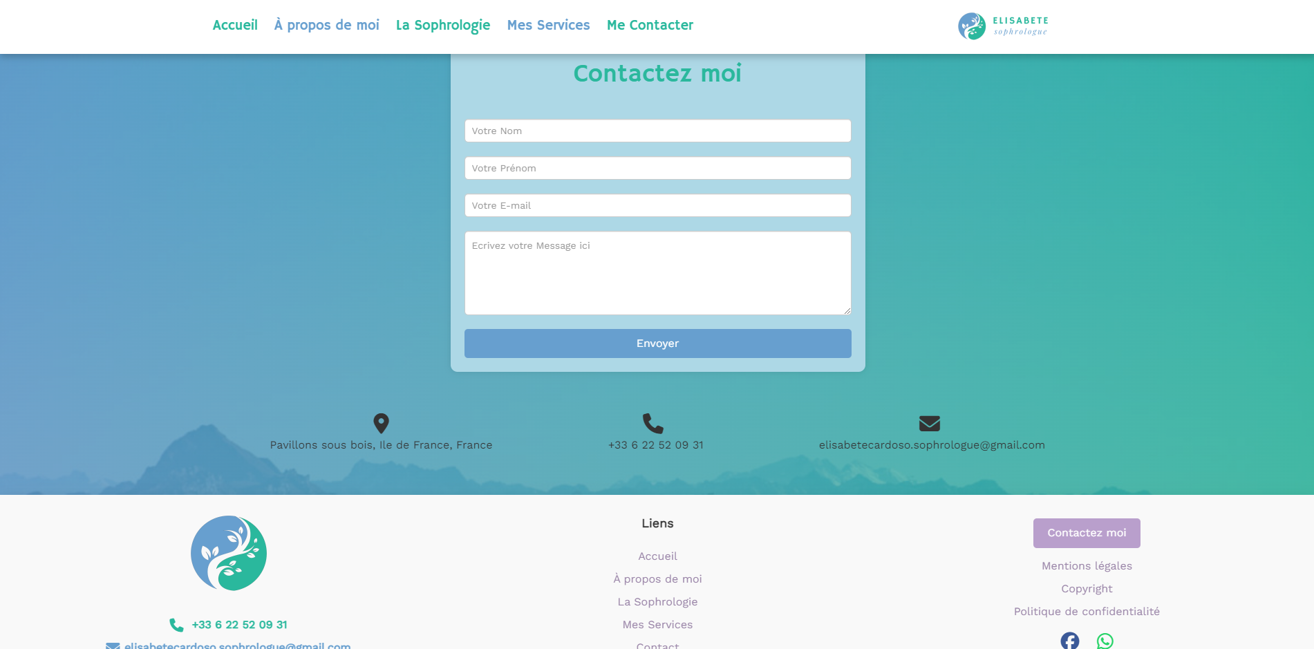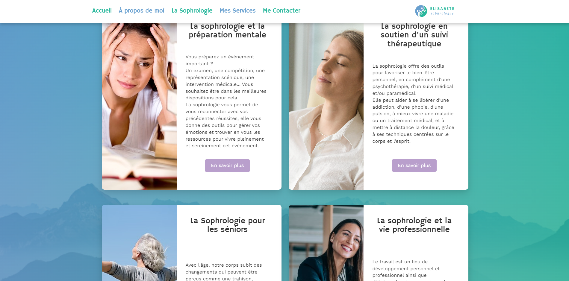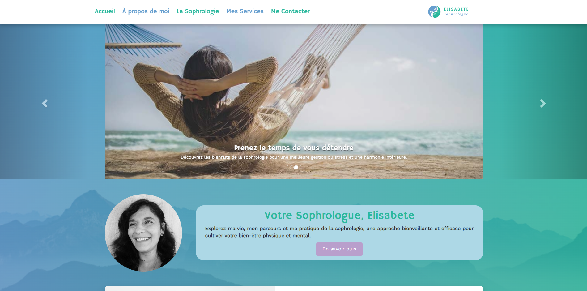 Ce projet avait pour objectif de fournir à Elisabete une plateforme en ligne professionnelle pour informer ses clients actuels et potentiels sur les différents services de sophrologie qu'elle propose.