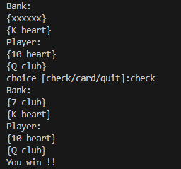 L'interface console offre une expérience de jeu interactive, permettant aux joueurs de voir leurs cartes et de prendre des décisions, comme demander une carte supplémentaire (card) ou vérifier (check).